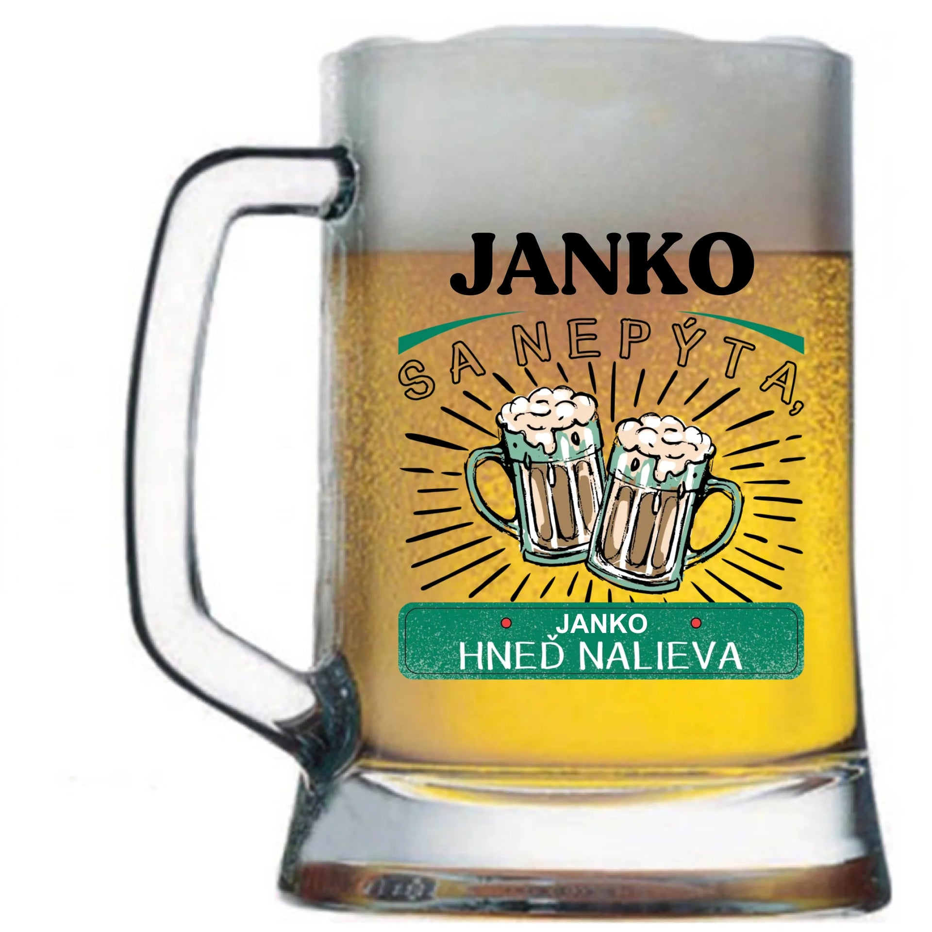 Pivový krígel s potlačou *meno* sa nepýta *meno* hneď nalieva